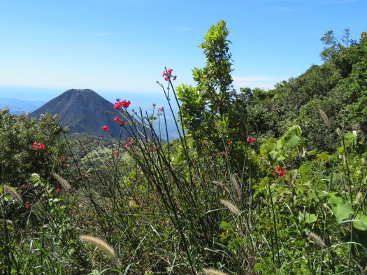 Maar we gaan natuurlijk wel gewoon op pad. Je weet maar nooit. En onder begeleiding van een gids en politieagent gaan we van start. En het is schitterend onderweg. Iedere bocht geeft weer een ander mooi uitzicht op de omgeving en de Izalco vulkaan. Ook het Lago Coatepeque is goed te zien. Onderweg moet ik me af en toe al even vasthouden als er opeens weer een harde windvlaag komt. Maar als we bijna bij de top zijn, is het echt lastig om mijn evenwicht te bewaren. De politieagent besluit dan ook dat het te gevaarlijk is om door te lopen. En daar kan ik me wel in vinden. Hier heb je nog iets van beschutting tegen de rotsen. Het laatste stuk is een grote open vlakte. Jammer, maar de wandeling is ook zonder top, de moeite waard.