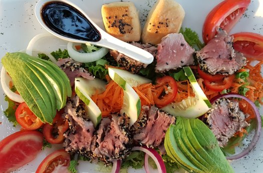 Henk gaat ’s avonds met de schildpaddentour mee. Deze vertrekt al om 18:30 uur. Omdat we ’s middags niets op hebben eten we met z’n drietjes bij de La Dolce Vita. De Beach club waar wij de hele middag hebben gezeten. We hebben heerlijk gegeten. Cocktailtje erbij, voorgerecht met allerlei soorten vis en smakelijke hoofdgerechten. Ik had een tonijnsalade. Niet echt slecht!