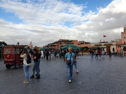 We lopen nog iets verder tot we op het plein Djemaa el-Fna aankomen. Hier laten we alle indrukken nogmaals op ons inwerken. Verkopers zitten aan de randen van het plein met kameeltjes, armbanden en horloges voor zich uitgestald op de grond. De slangen en apen doen hun kunstjes weer. En alle verkopers proberen iets te verkopen