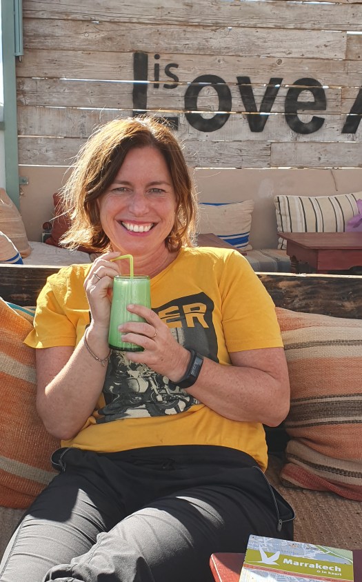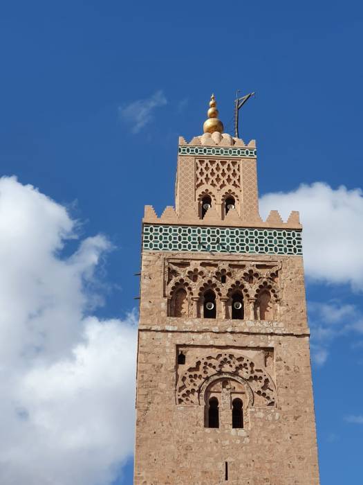 We stappen uit bij de Koutoubia-moskee. Hét herkenningspunt van Marrakesh. De minaret uit de twaalfde eeuw is vrijwel overal in de oude stad zichtbaar. Altijd handig voor types zoals ik.
