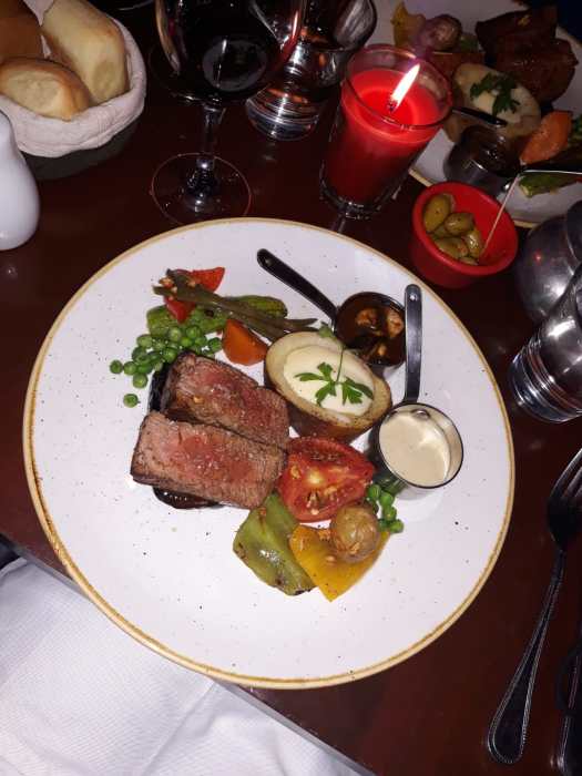 De hele dag niet gegeten. Kwam er gewoon niet van. Op Tripadvisor gezocht en bij een Spaans restaurant L’auberge Espagnole belandt. En wat was het eten lekker. We hadden eerst nog wel geluk. Bij binnenkomst stond er op alle tafeltjes “gereserveerd”. Gelukkig hadden we een lieve serveeerster. Zij heeft voor een mooi plekje gezorgd en ons steeds weer de heerlijkste gerechten gebracht. Echt een aanrader. Voor Henk was het helemaal een topavond. Het restaurant was ook een soort sportcafe. Minimaal 10 gigantisch grote t.v.-schermen hangen er in het restaurant. Overal is voetbal te zien. Dat was ook de reden van alle reserveringen. De Spaanse clubs spelen Europees voetbal.