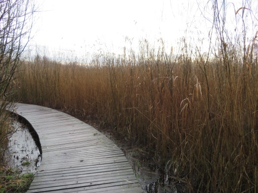 We lopen eerst langs de golfbaan. Daarna over een vlonder door het water. Riet aan de ene en een grote vijver aan de andere kant. Boven het water hangen een prachtige wolken.