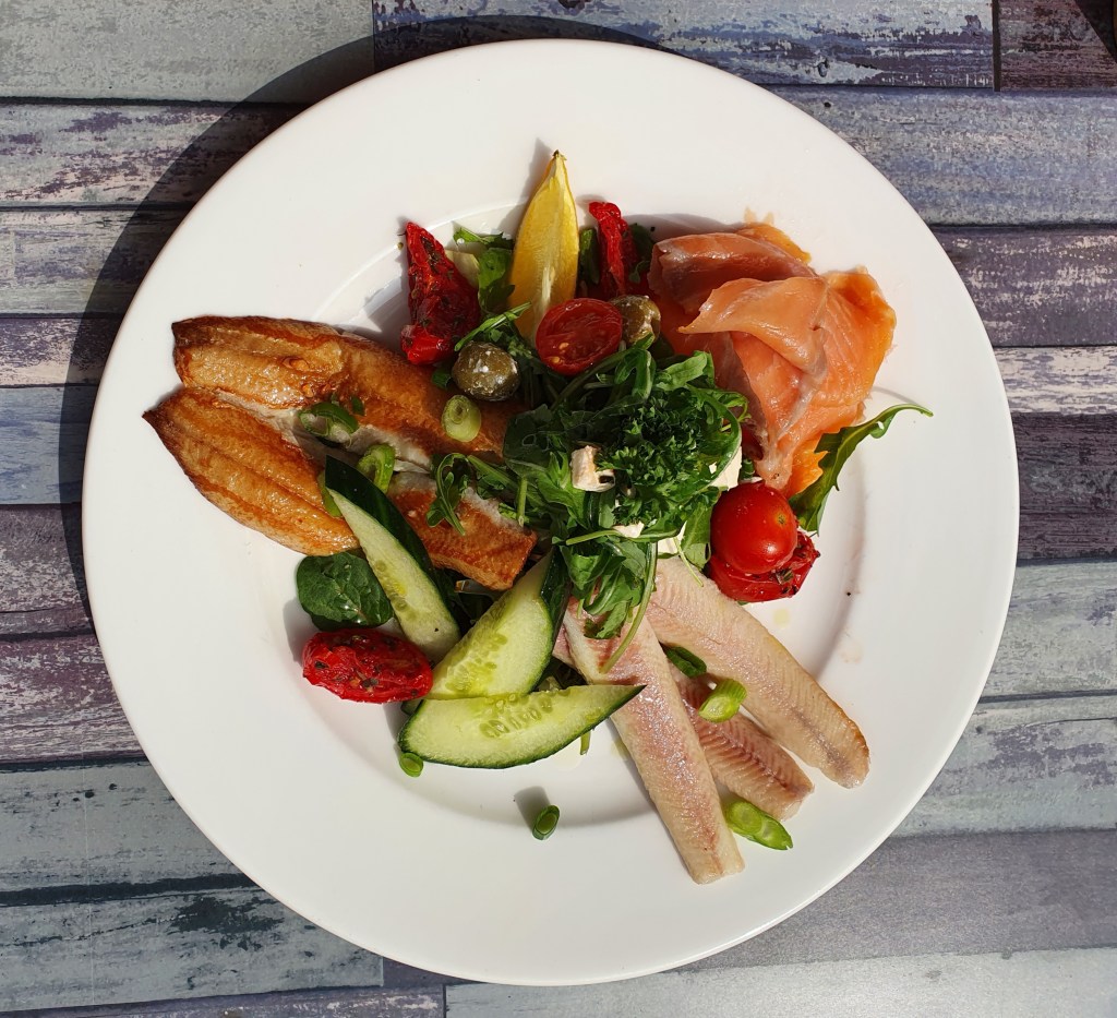 Gelukkig is er bij de restaurantjes nog enoeg vis op de kaart te vinden. Bij restaurant De Herberg kies ik voor de salade Rookton. Een combinatie van gerookte paling, haring en zalm.