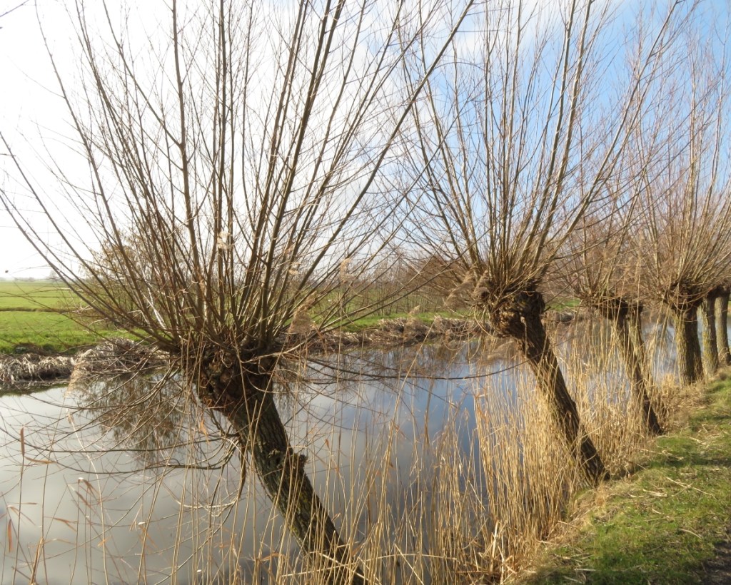 Vanaf Polsbroek wandel je over houtkaden dwars door de polders. Langs de kades staan veel knotwilgen en elzen. De knotwilgen zijn net gesnoeid. Langs de kanten liggen takkenbossen te wachten om te worden opgehaald.