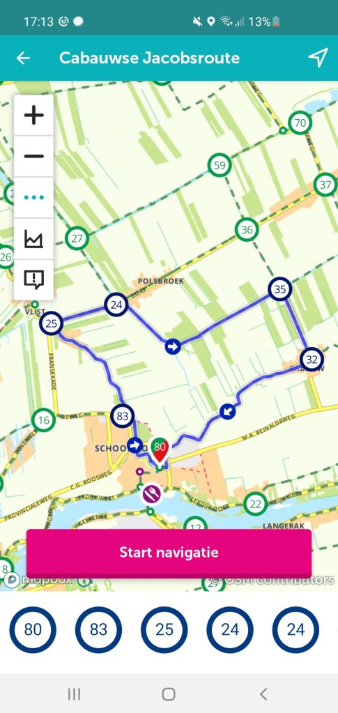 De papieren versie die ik had bewaard was nog zonder wandelknooppunten. Tegenwoordig ben ik daar een echte fan van en probeer naast de route ook altijd de knooppunten erbij te zoeken. Via de app van route.nl gaat dit perfect.