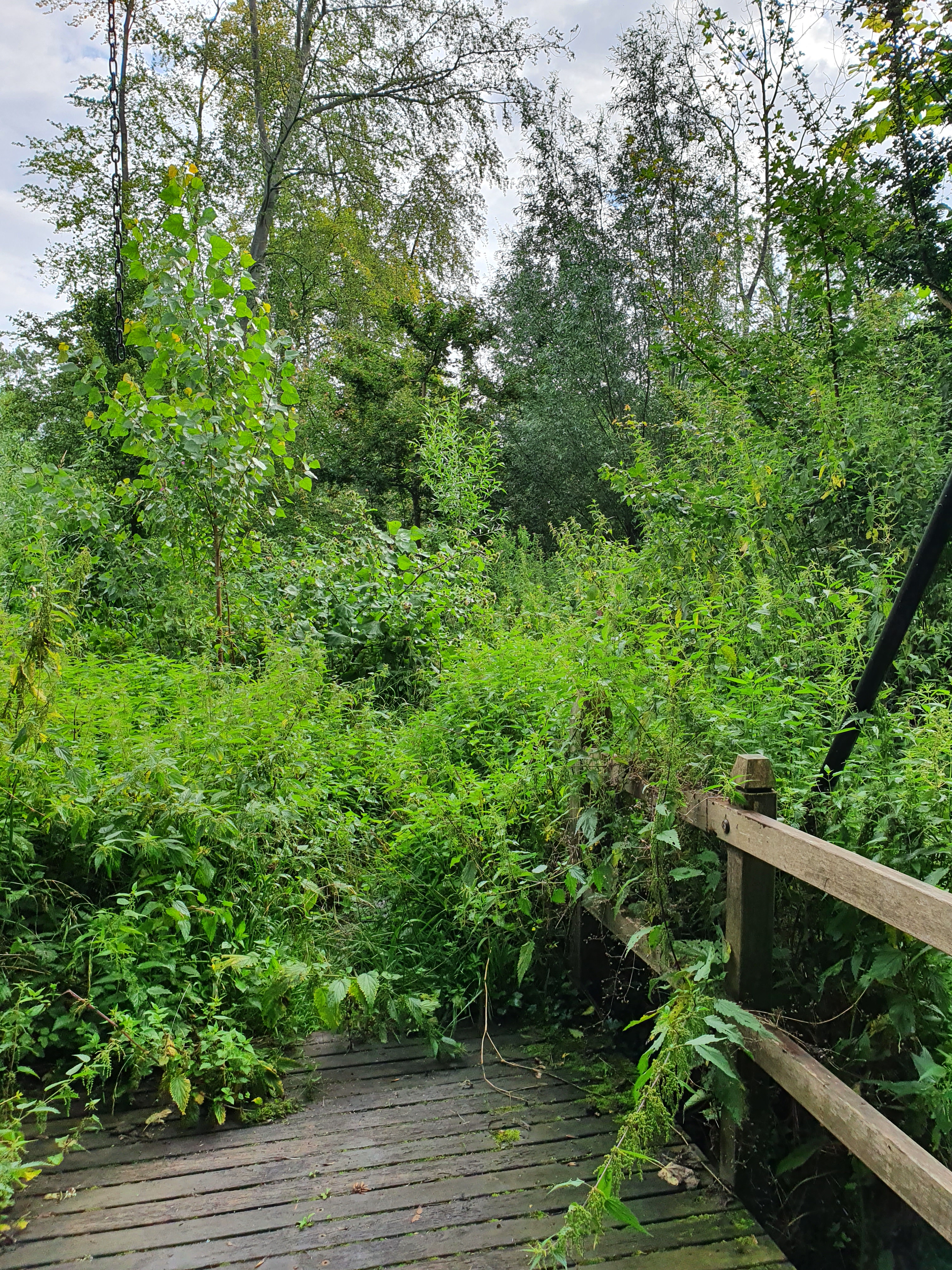 In de route zit een klein stukje waarbij ik dacht, doe ik het wel of doe ik het niet. Het pad was onbegaanbaar. Ik heb het even geprobeerd, maar na 10 meter tussen grote distels en brandnetels te hebben gelopen, weer teruggekeerd.  Meestal denk ik bij dit soort paadjes, leuk, maar dit was echt te erg. Na mijn huid goed te hebben gecontroleerd op beestjes loop ik met schrammen en brandneteljeuk weer verder.