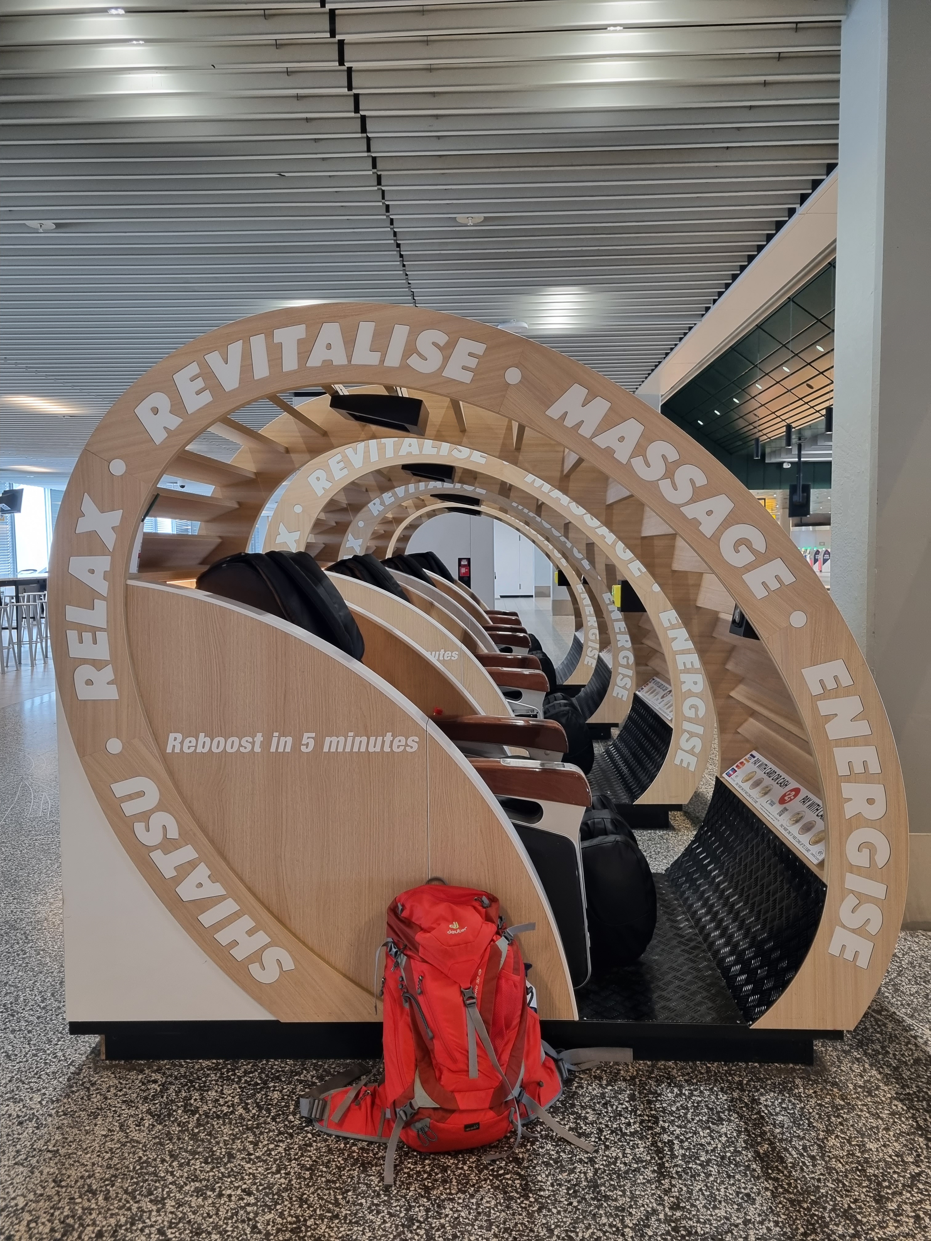 Het leek erop dat alle massagestoelen waren weggehaald, maar gelukkig heb ik er toch nog één gevonden. Heerlijk nog even relaxen voor de vlucht.